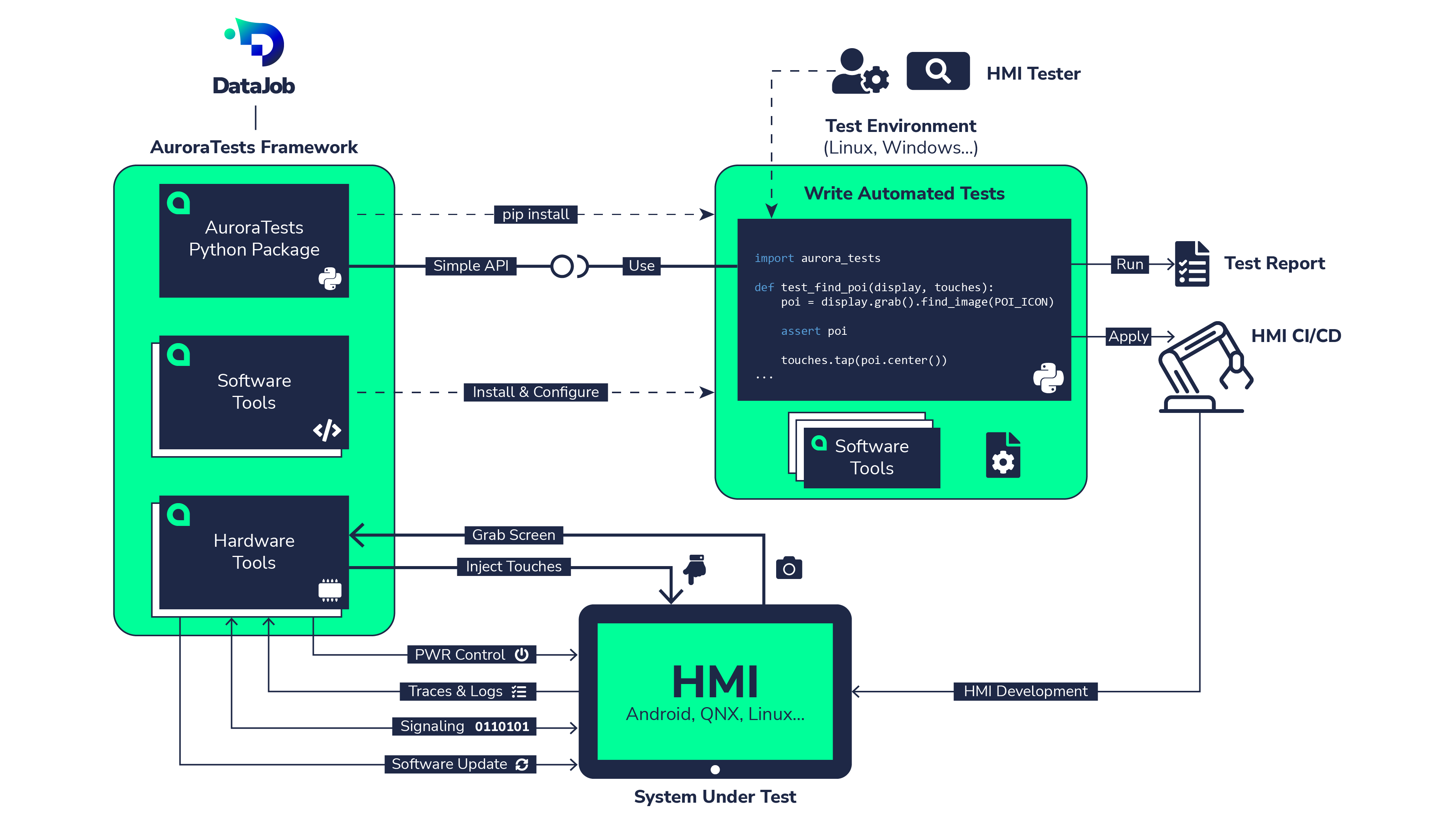 The high-level architecture of AuroraTests, as illustrated in the diagram, showcases its modular design and robust capabilities, making it an ideal solution for a wide range of HMI testing scenarios.